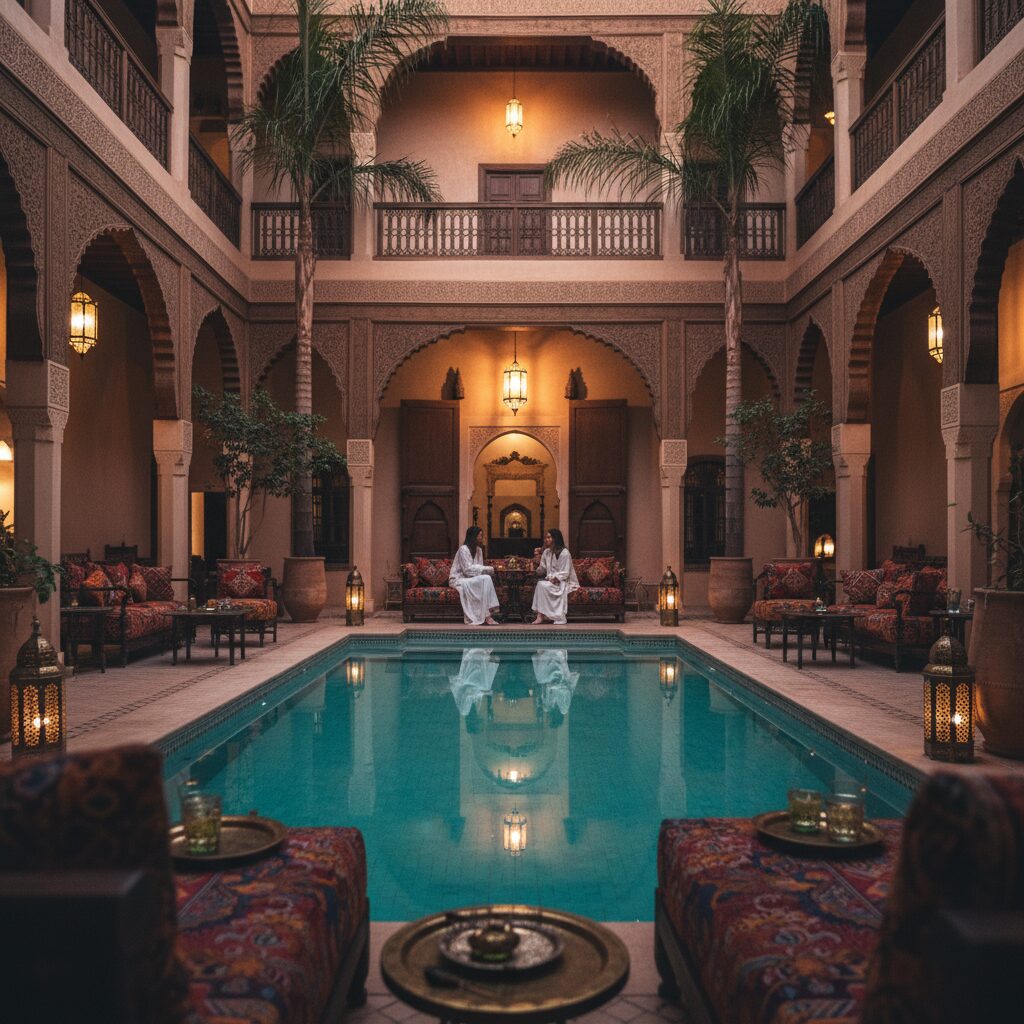 中等规模的里亚德(7至15间房)在亲密感与完善设施之间找到平衡。它们通常配备小型游泳池、舒适的屋顶露台,甚至可能有土耳其浴室(Hammam)。这些里亚德拥有专业服务团队,提供酒店式的标准化服务,如全天候前台与预订服务,同时保留独特建筑风格和温馨氛围,是多数游客的热门选择。
